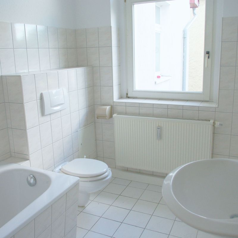 - Beispiel 1-Raum-Wohnung: Hochparterre, separater Eingang, Windfang und Flur, Tageslichtbad mit Wanne, WC und Waschtisch, Küche mit Fliesenspiegel, großer Wohn-/Schlafbereich mit 2 Fenstern und PVC-Belag