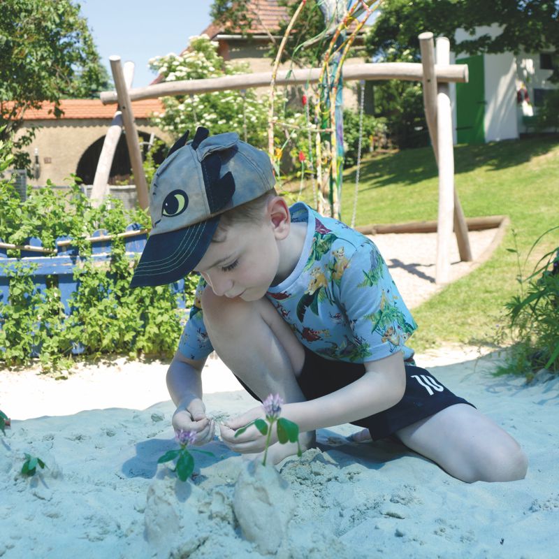 • naturnaher Garten mit viel Grün, in dem die Kinder nach Herzenslust matschen, buddeln, mit Steinen, Stöcken und Sand spielen können
